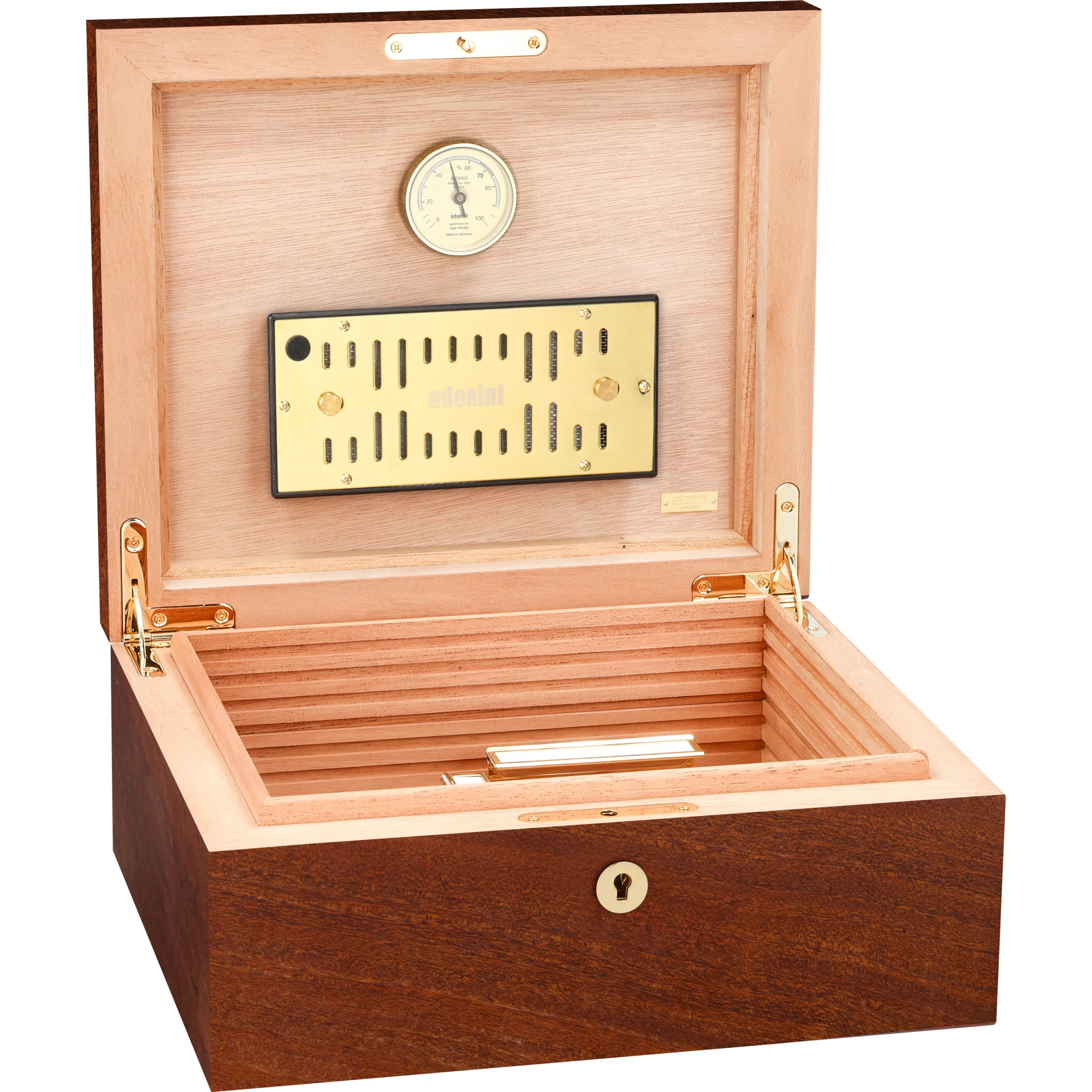 - Gold plated acryl polymer based Adorini Deluxe humidifier with adjustable ventilation openings for an optimum regulation of the humidity level