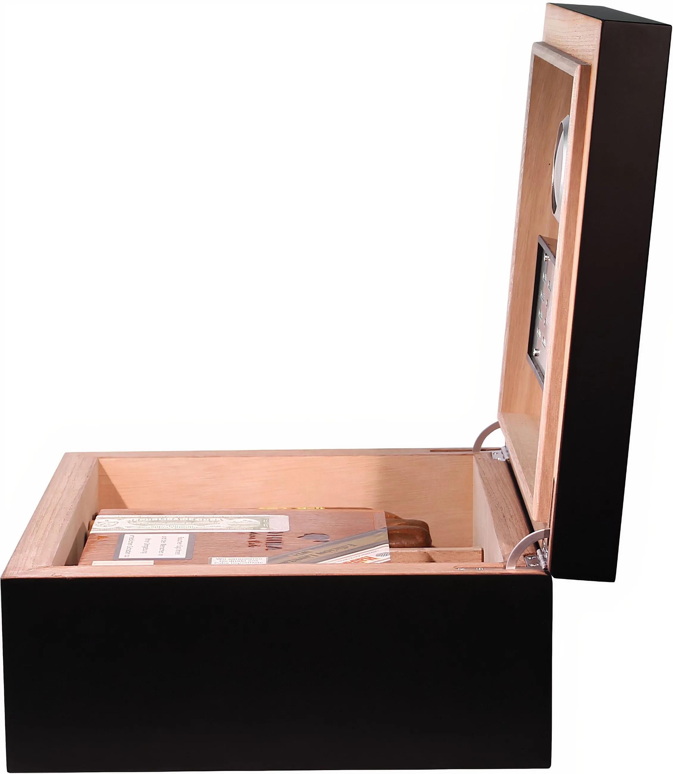 Humidor Adorini černý základní M Moderní a funkční humidor značky adorini z řady Basic ve velikosti M zaujme svým matně černým vzhledem a všestranností. Nabízí ideální řešení pro bezpečné uložení vašich doutníků, jelikož má kapacitu na zhruba 75 doutníků nebo na menší boxy na doutníky. Součástí balení je analogový vlhkoměr a pasivní houbový zvlhčovač. Vlhkoměr měří vlhkost na základě kovové spirály a je magneticky a flexibilně připevněn k víku humidoru společně se zvlhčovačem. Humidor má uvnitř matně stříbrné panty a obzvláště silný těsnicí lem, který zajišťuje optimální udržování vlhkosti. Vertikální rozdělovací přepážka umožňuje další rozdělení vnitřní plochy.