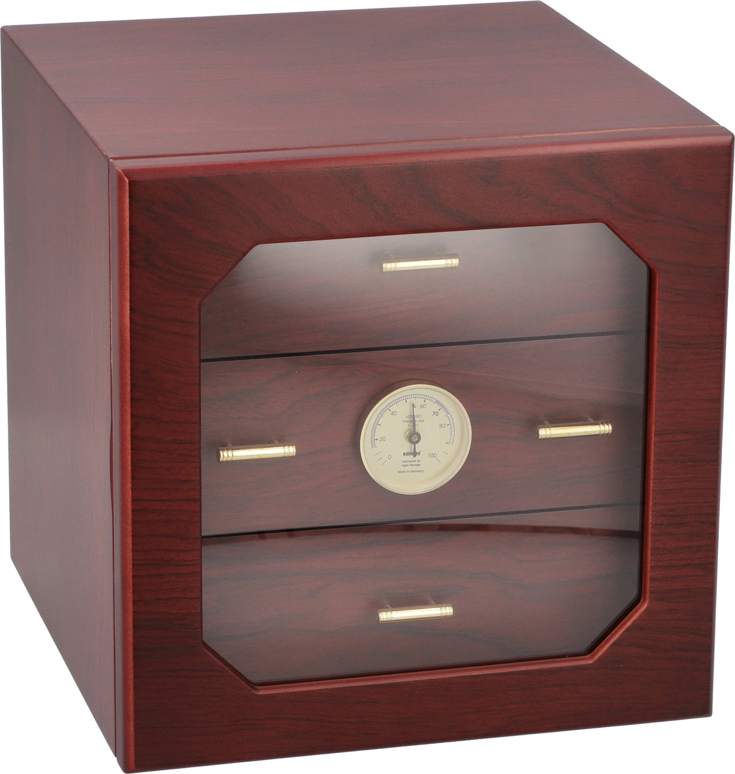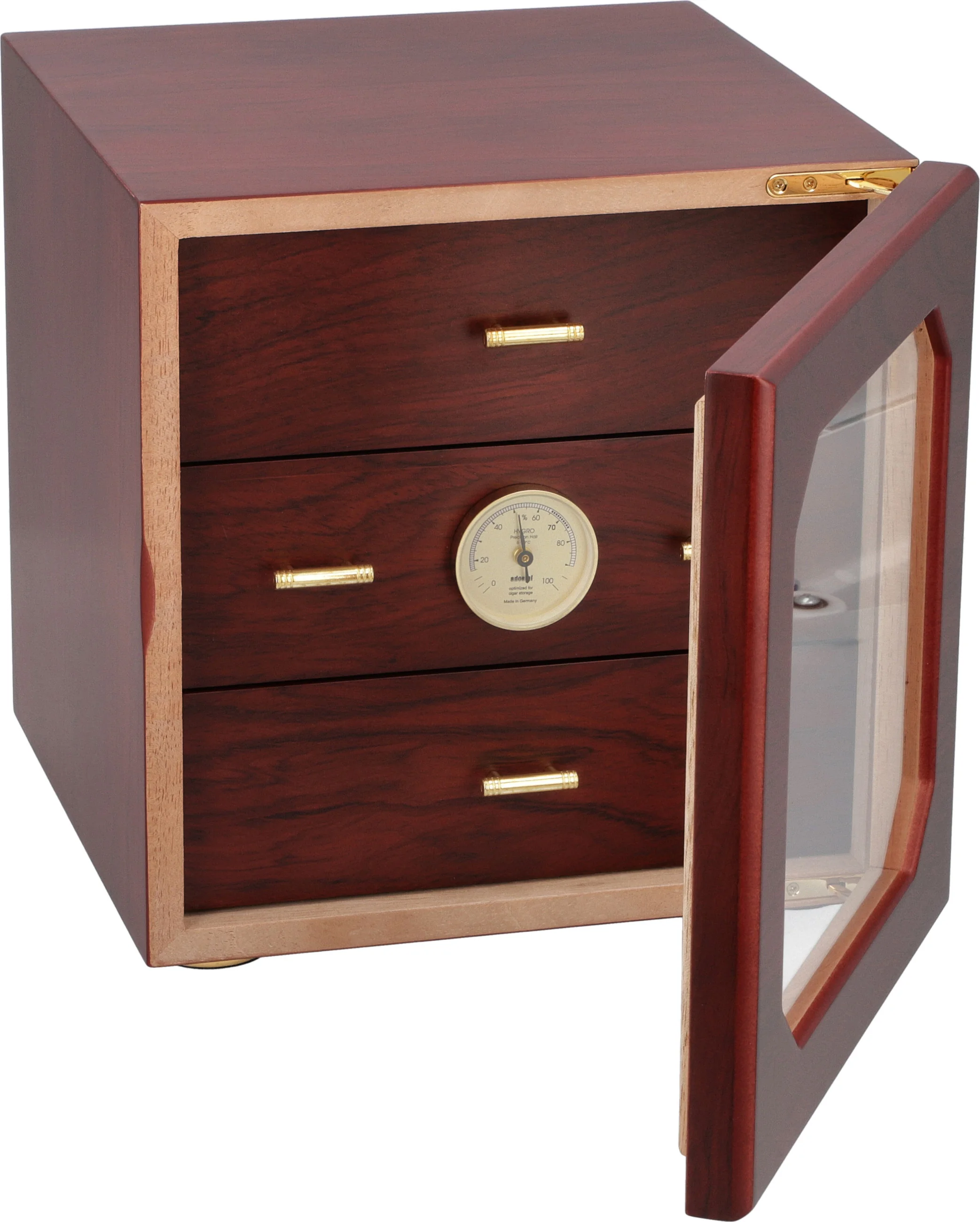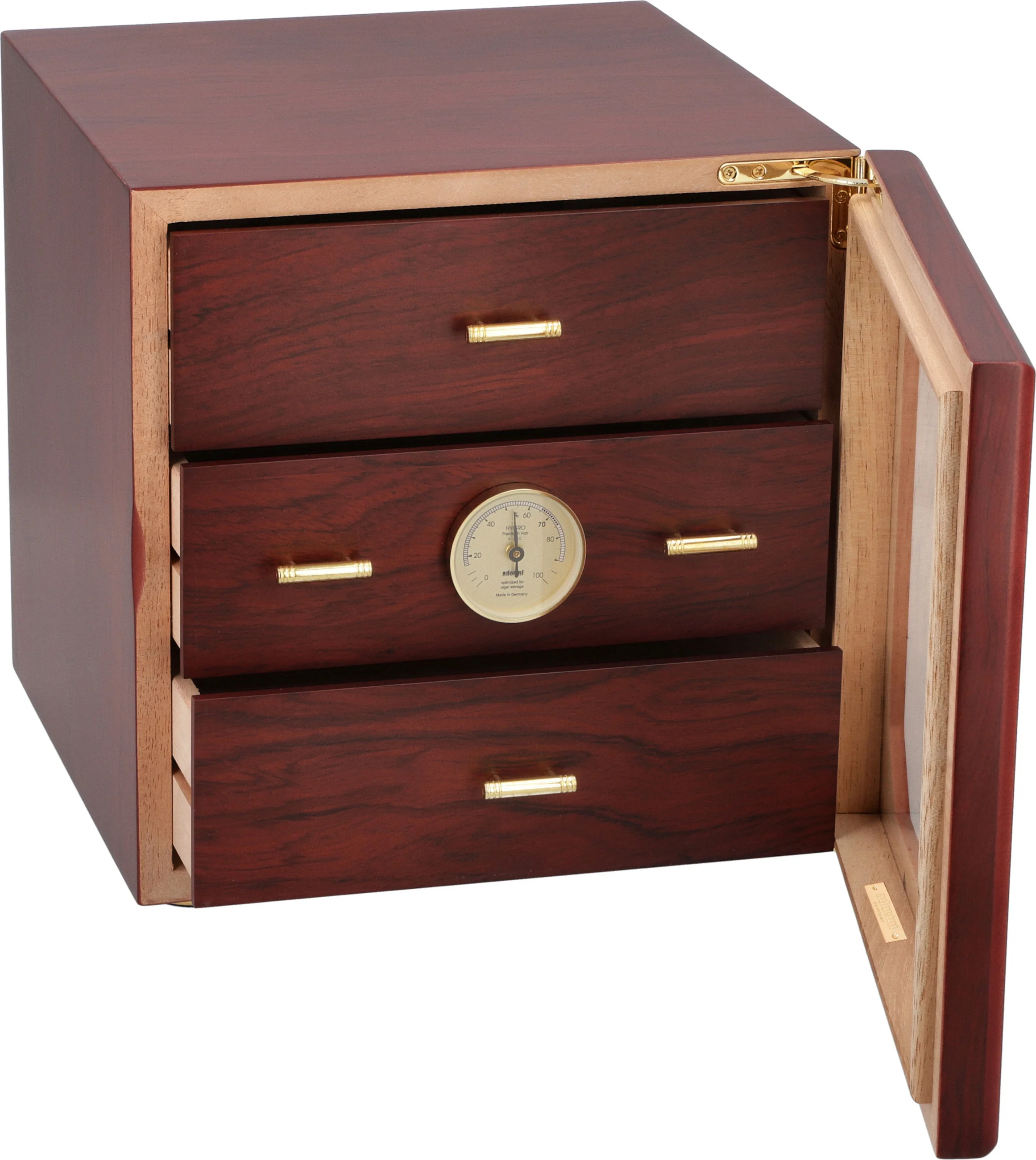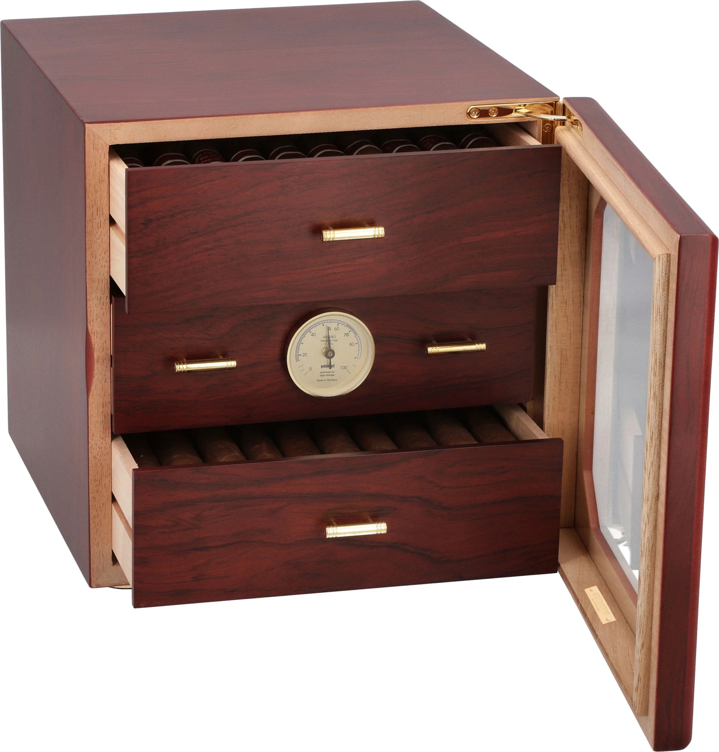 Humidor pojme více než 125 doutníků standardní velikosti Corona, které udržuje v optimálním stavu luxusní pozlacený zvlhčovač adorini na bázi akrylového polymeru. Nastavitelné větrací otvory umožňují přesně nastavit úroveň vlhkosti tak, aby vyhovovala vašim požadavkům. Předem kalibrovaný přesný vlasový vlhkoměr je umístěn na přední straně středového zásobníku a vyžaduje pouze rychlé nahlédnutí pro kontrolu úrovně vlhkosti, ať už je humidor otevřený nebo zavřený.