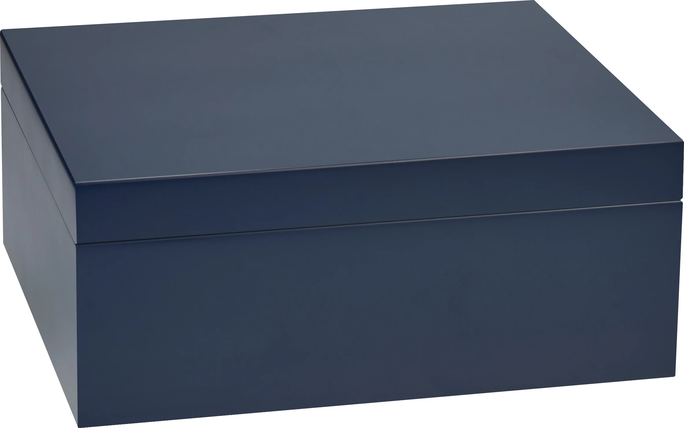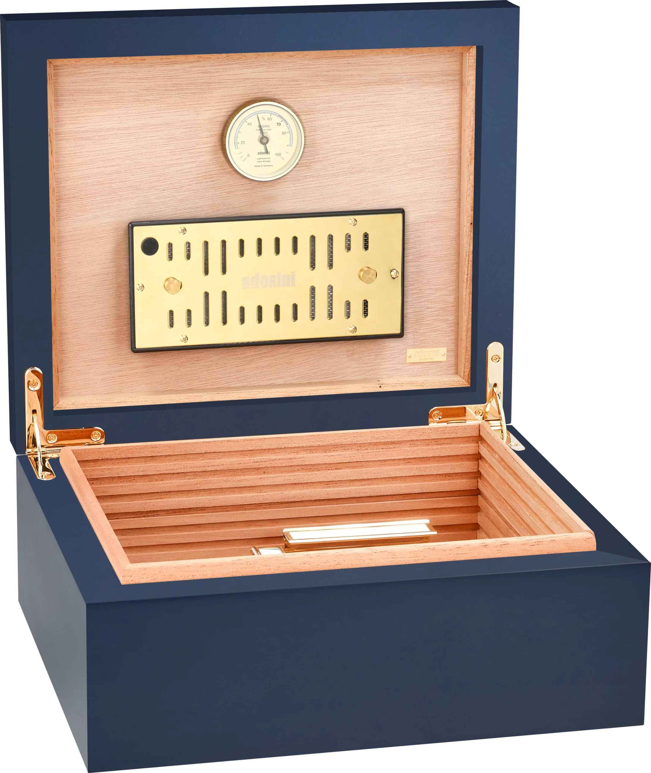 The adorini Humidor Medium Deluxe Midnight Blue is part of the new adorini collection in four exciting color variations. This model impresses with a sophisticated, timeless dark blue, enhanced by gold elements on the interior. Particularly noteworthy is the matte blue soft-touch finish, which extends beyond the outer edge and is thus also visible on the interior. This gives the humidor a harmonious and elegant overall effect.