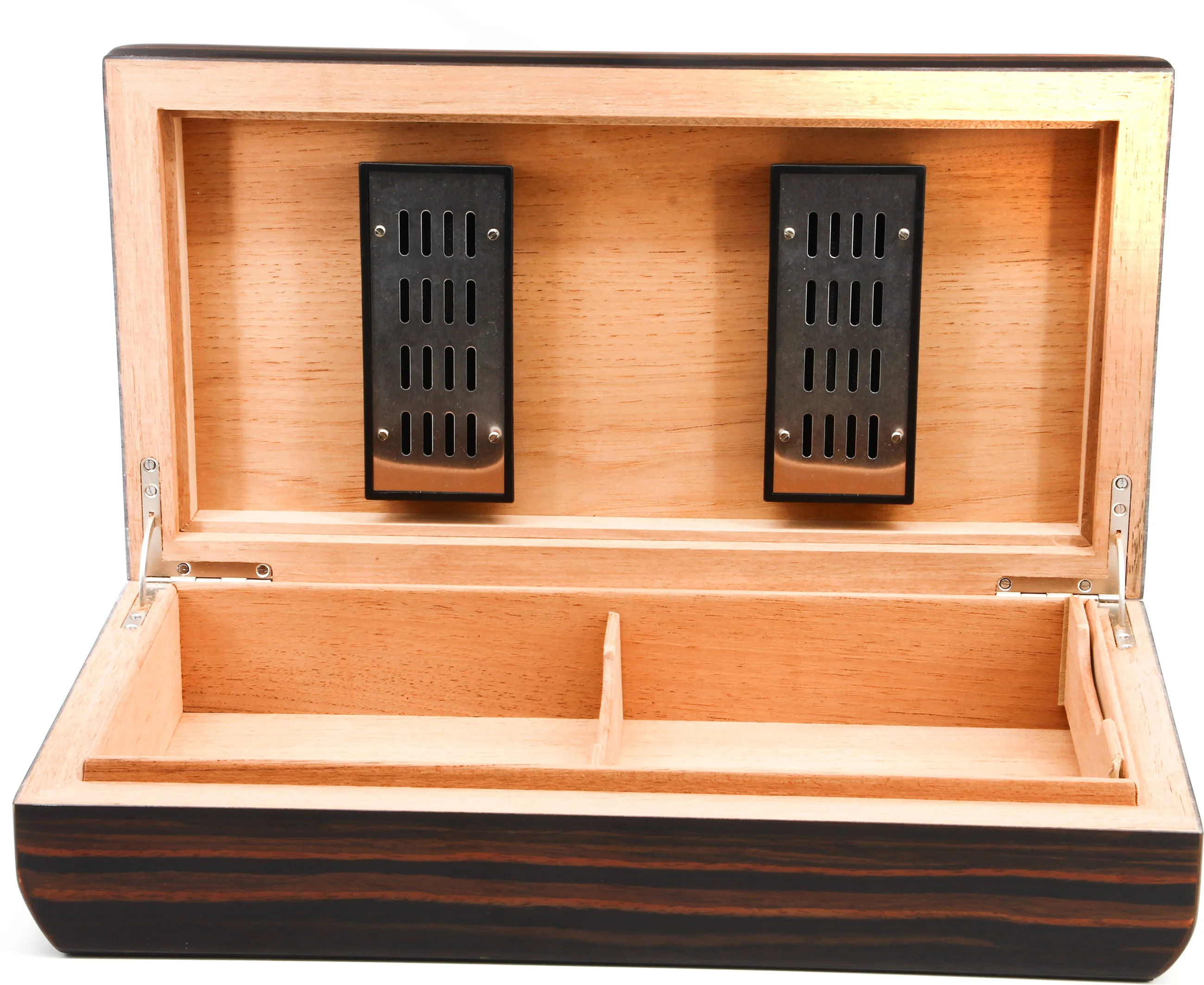 Vnitřek z cedrového dřeva nabízí dostatek prostoru pro až 80 doutníků velikosti Corona, které lze uspořádat díky odnímatelné přepážce. Dva samoregulační zvlhčovače poskytují veškerou potřebnou regulaci vlhkosti. Stačí přidat destilovanou vodu a můžete si být jisti, že vaše doutníky dostanou spolehlivou a stálou vlhkost, a vy se tak budete moci věnovat relaxaci s dokonale upraveným kouřem.