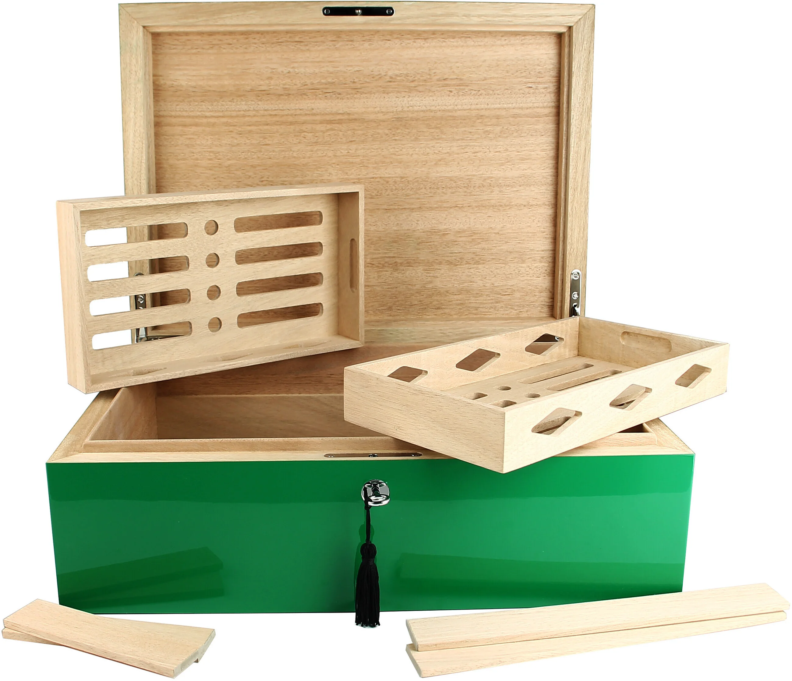 VillaSpa Humidor Green bude mít díky svému sytě zelenému laku (Pantone 554C) zelenou barvu, kterou vám budou všichni závidět. Sada l zámku a klíčů zajišťuje klid a pohodlné zásuvné úchyty usnadňují manipulaci s humidorem. Všechny tyto vlastnosti dohromady vytvářejí atraktivní humidor, který musíte mít. Kapacita až pro 240 corona doutníků.