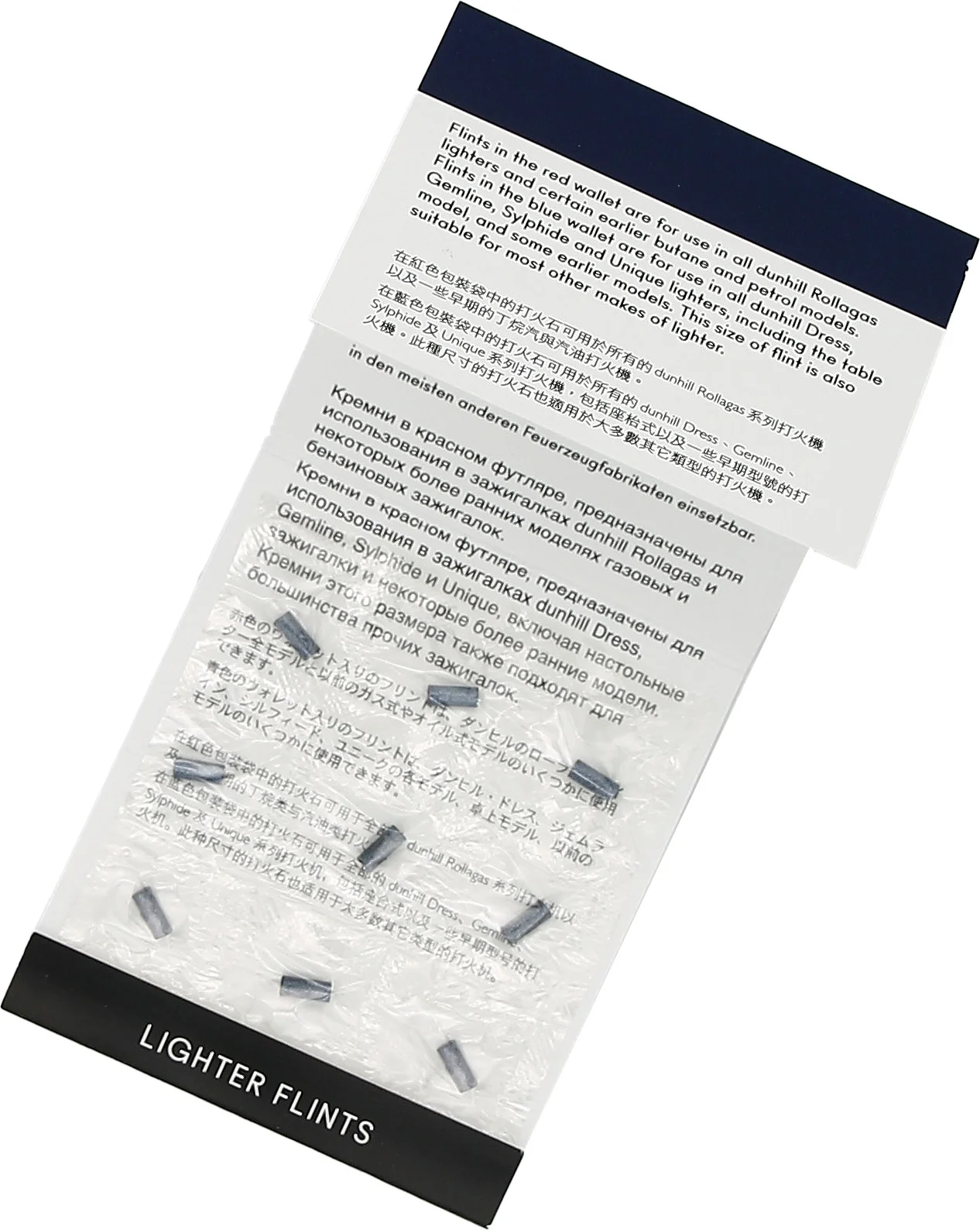 The Dunhill flints in size A (blue) are specially designed for Dunhill lighters from the "Unique" line. One pack contains 9 high-quality flints that ensure reliable ignition and long service life of your Dunhill lighter.