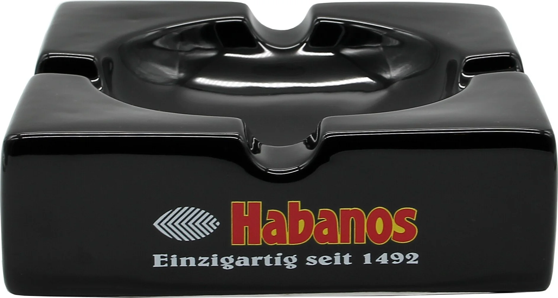 This square porcelain ashtray from Habanos impresses with its elegant black finish and the German inscription "Unique since 1492", which refers to the founding year of Habanos and adorns the front of the ashtray. It is ideal for enjoying cigars in company, as it features four generously sized cigar rests.