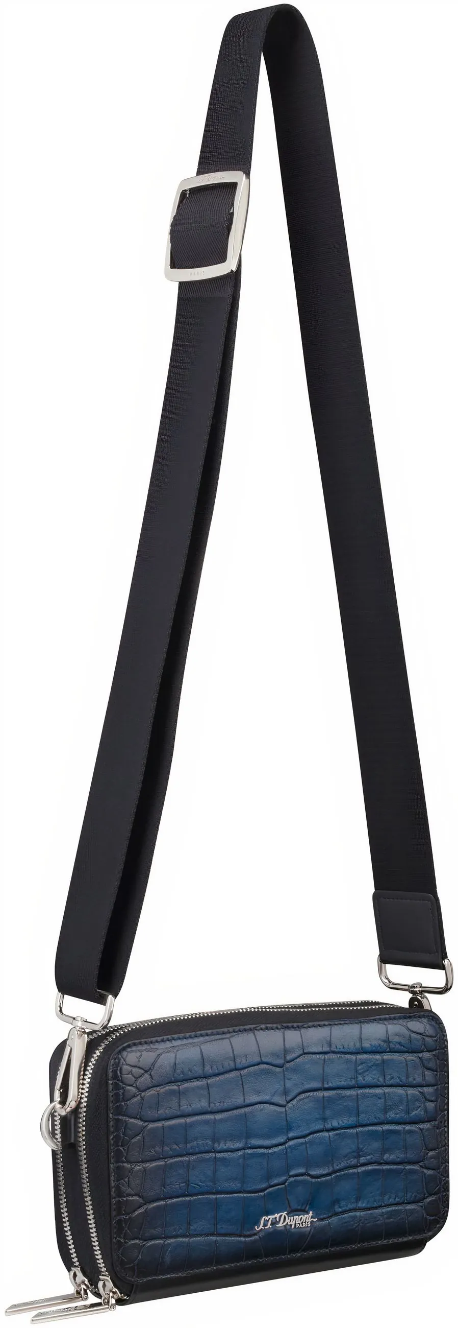 Taška přes rameno S.T. Dupont Le Grand Atelier Cigar Crossbody Bag v modré barvě je stylovým doplňkem pro kuřáky doutníků. Tato malá taška přes rameno je vyrobena z telecí kůže s vyraženým krokodýlím vzorem a nabízí elegantní a praktické řešení pro přepravu doutníků a příslušenství. Taška je ideální pro přenášení pouzdra na 3 doutníky od společnosti S.T. Dupont spolu s příslušenstvím.