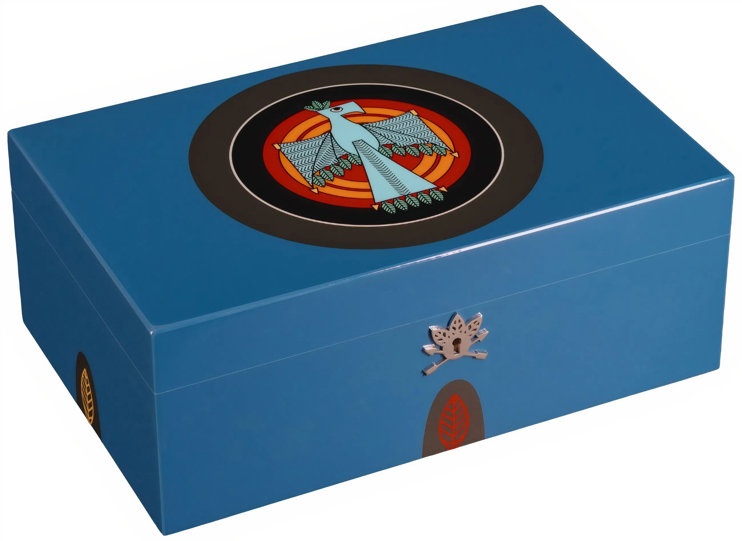 Humidor značky Totem s motivem hromového ptáka v úžasném modrém odstínu a s lesklou povrchovou úpravou je nádherným kouskem. S velkorysou kapacitou 100 doutníků a rozměry 36 x 23 x 14 cm dokonale spojuje estetiku s funkčností.