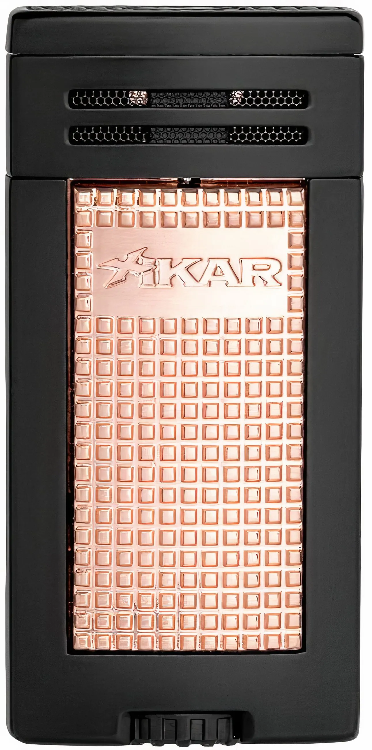 **Zapalovač Xikar Ion s dvojitým plamenem v černé barvě s růžovým zlatem** je vysoce kvalitní a spolehlivý zapalovač od mezinárodně uznávané značky Xikar. Vyniká moderním sportovním vzhledem, který připomíná design z automobilového průmyslu. Matné černé tělo a přední tlačítko v elegantní barvě růžového zlata pro zapálení plamene dodávají zapalovači elegantní vzhled.